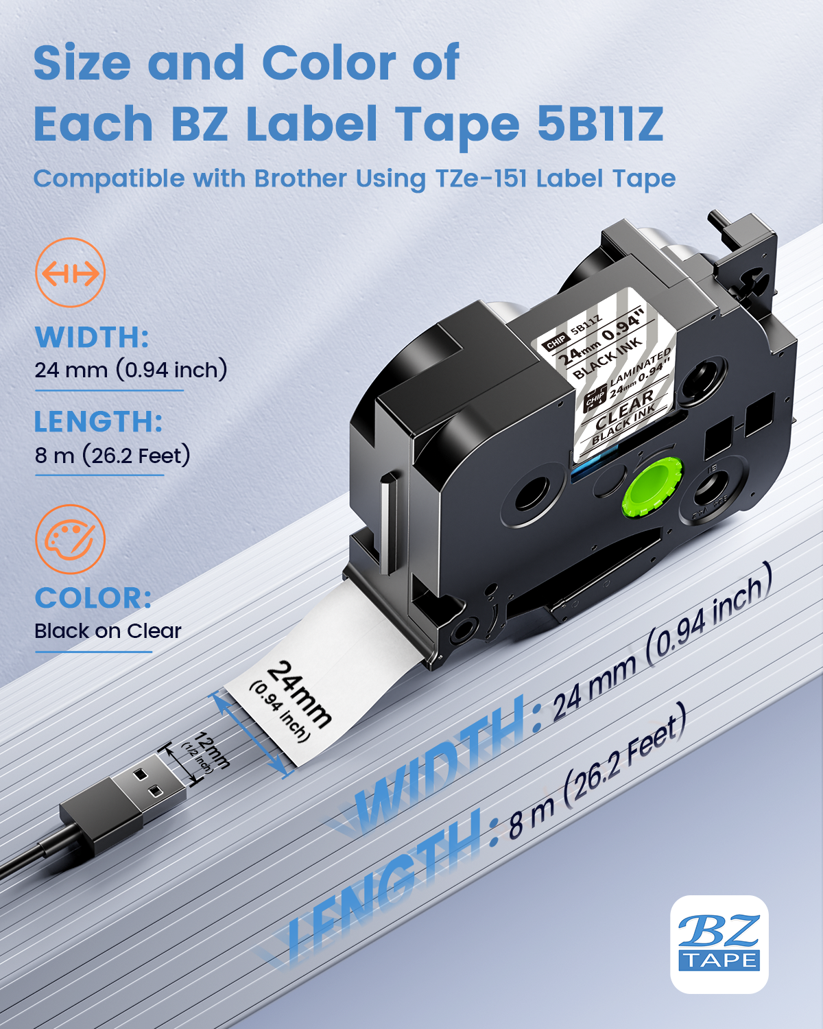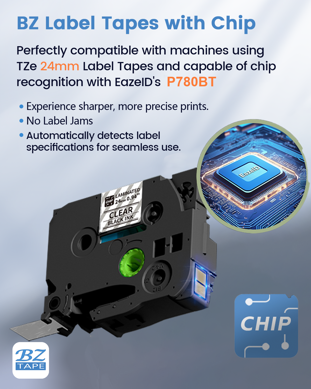 - Easy-peel: These EazeID TZe TZ Tape 24mm 0.94 inch laminated white label tapes TZe-151 have split backing for easy peeling and quick apply