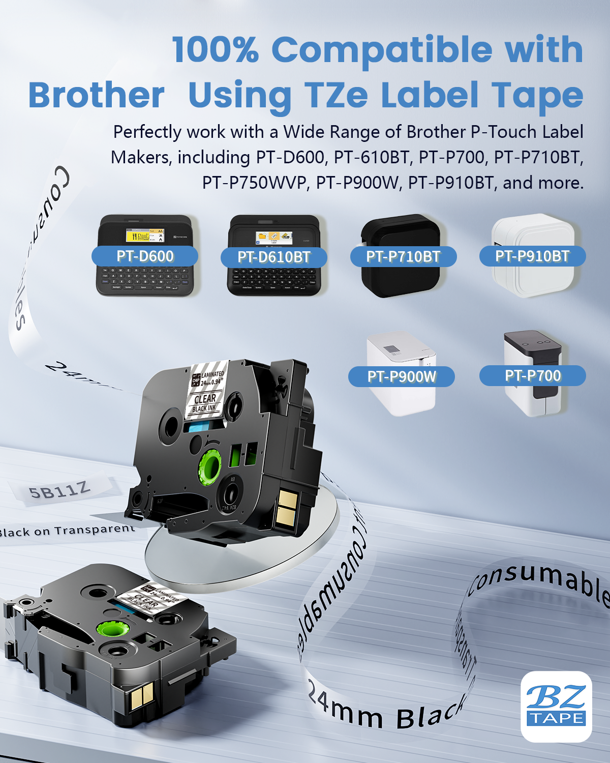 - Compatible with Brother Ptouch label makers that use up to 24mm 1 inch TZe label tapes: PT-D600, PT-D610BT, PT-D600VP, PT-P710BT, PT-P750WVP, PT-P700, PT-2730VP, PT-H500LI, PT-2730, PT-2430PC, PT-2300, PT-E500, PT-1400, PT-1500, PT-1500PC, PT-1600, PT-2110, PT-2200, PT-2210, PT-2300, PT-2310, PT-2400 and more