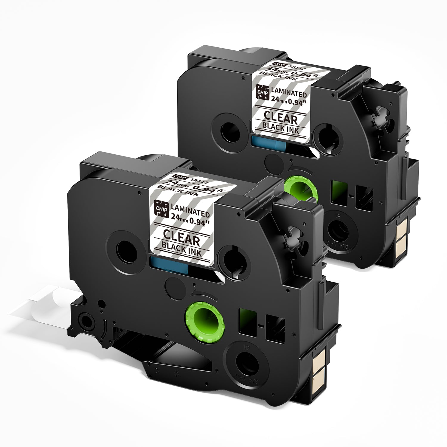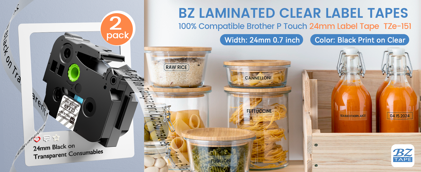 - Package includes 2-Pack EazeID label tapes replacement for Brother Ptouch 24mm TZe label tape TZe-151 (TZe151). Width: 1 inch (24mm/0.94 inch). Length: 26.2 feet (8 meter) for each, 52.4 Feet for 2-Pack. Color: Black on Clear