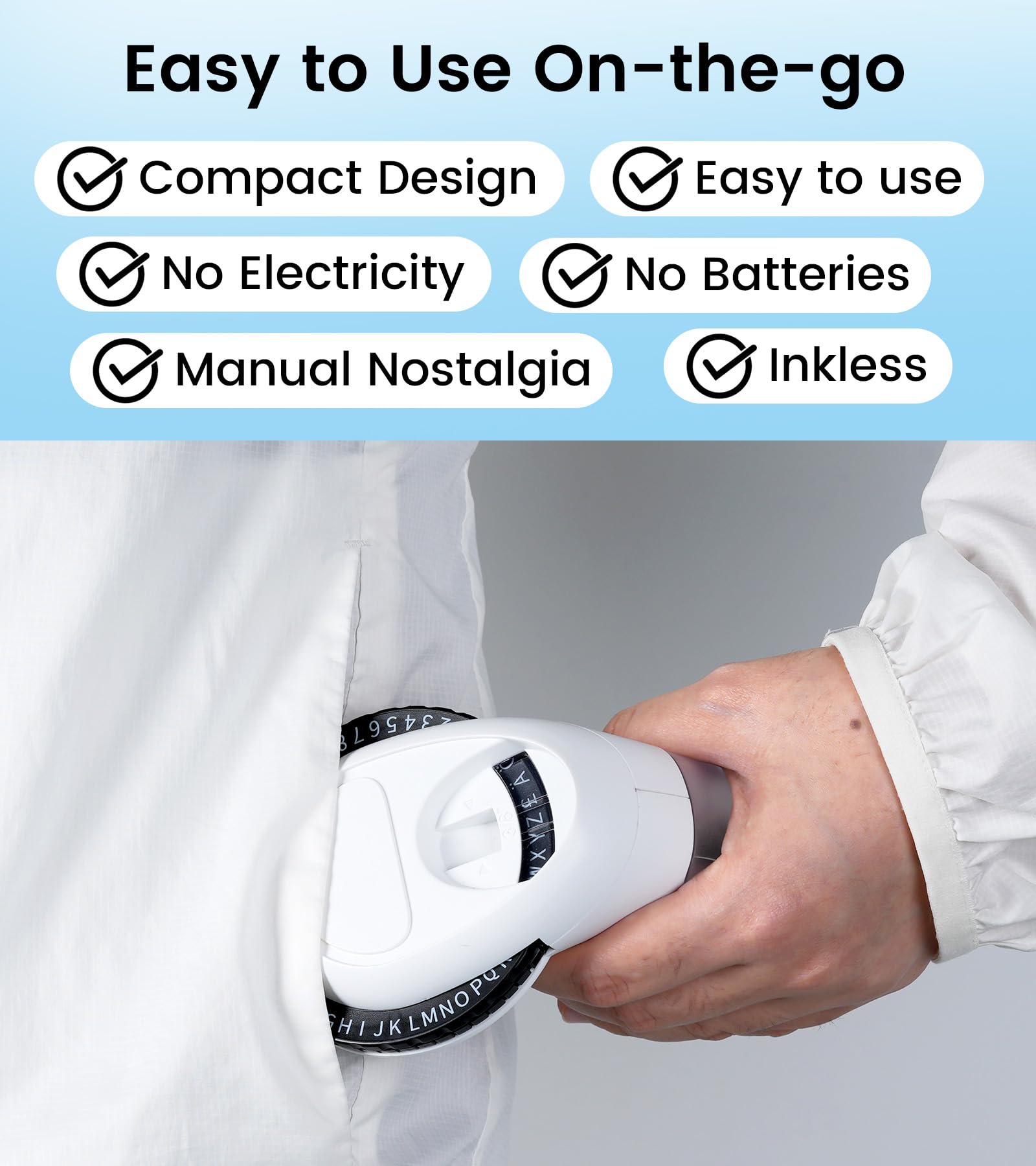 - Inkless 3D Embosser : EazeID manual embossing label maker machine with tapes brings back the nostalgic feel of the 1970s. The embossed label maker is incredibly user-friendly, no need batteries or ink. Simply turn the dial to select characters and press the handle to print out the label. Suitable for users of all ages