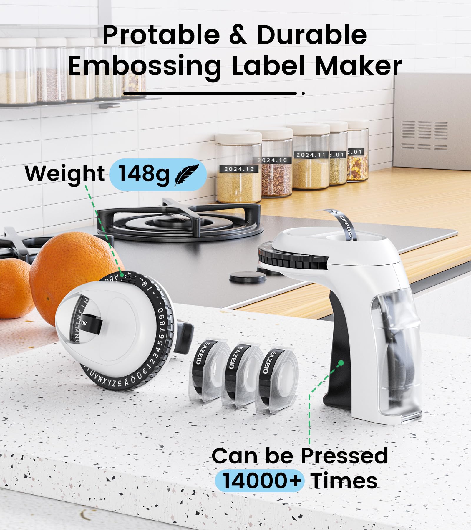 - Ergonomic Design Labeler : EazeID 3D Embossing Label Printer features an ergonomically designed handle for easy pressing. The built-in cutting design and pre-cut dividers make it convenient to peel off labels, while the dotted lines facilitate hassle-free labeling