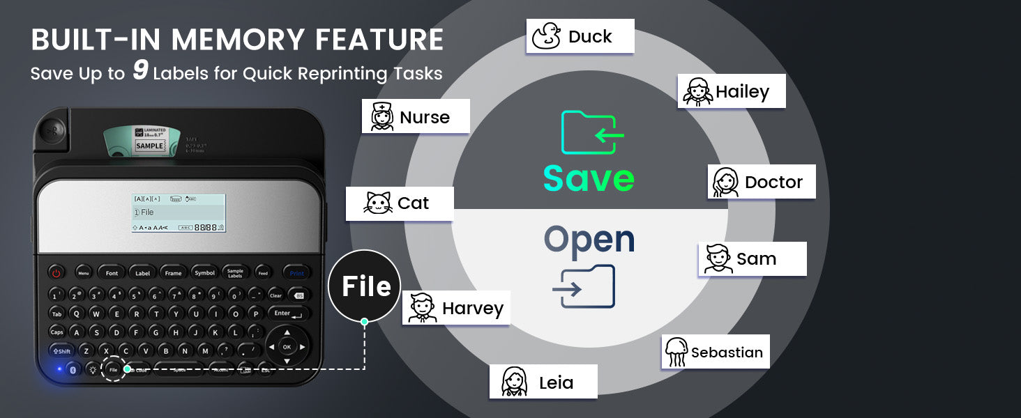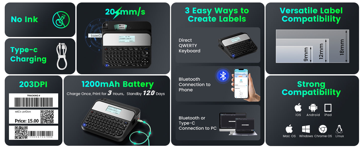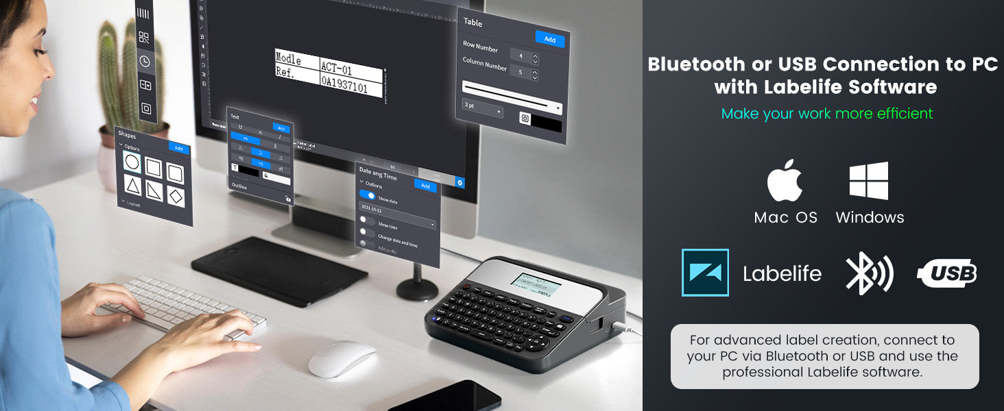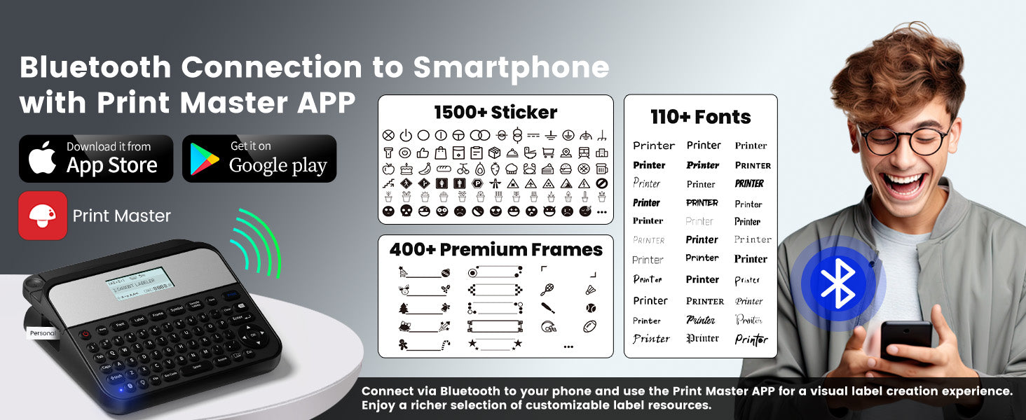 - 【Three Label Creation Modes】- ⌨️①Classic QWERTY Keyboard Label Maker: Quickly create labels with the traditional QWERTY keyboard layout, no phone needed. 🖥️②Easily connect to your computer via USB cable or Bluetooth. 📱 ③Utilize the Bluetooth Smartphone Sticker Labeler, compatible with both Android🤖 and Apple devices🍏.