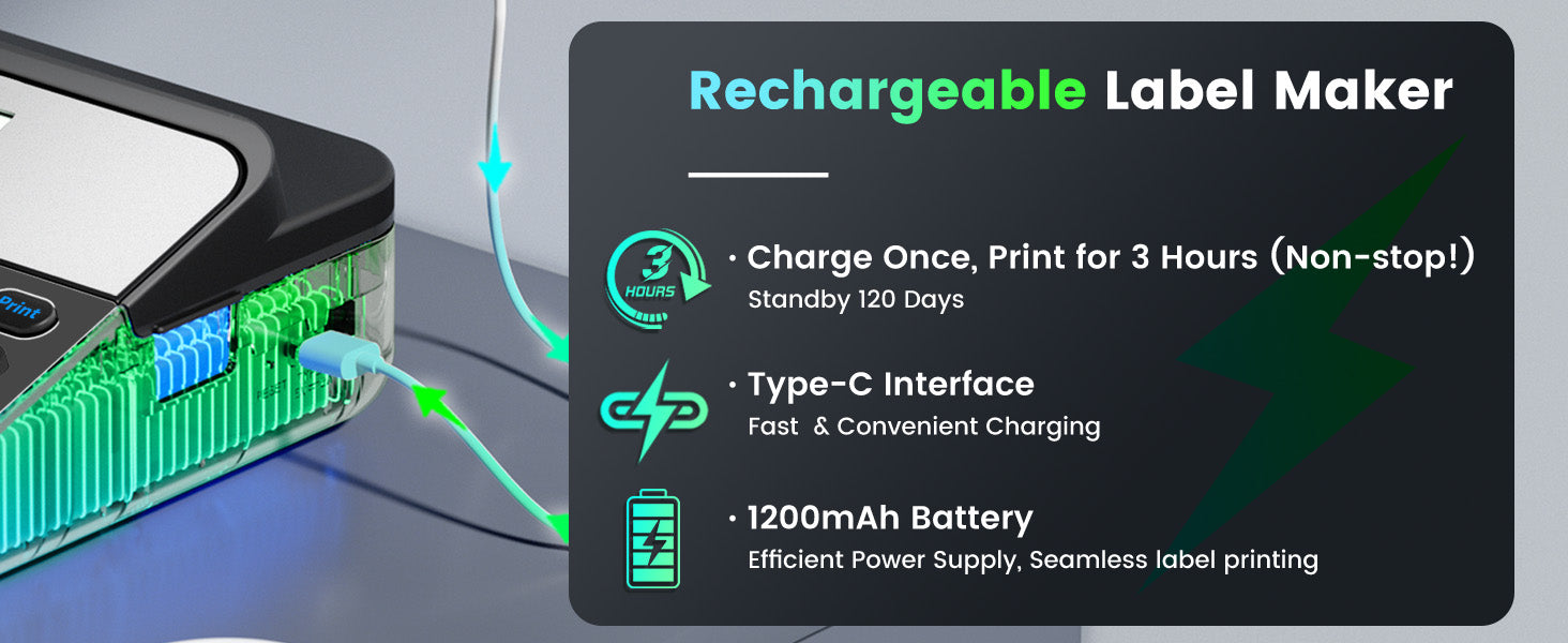 - 【🔋Eco-Friendly Rechargeable Battery♻️】- Featuring a 1200mAh rechargeable lithium battery, this label maker is both cost-effective and environmentally friendly. Enjoy longer usage times without the need for disposable batteries. The package includes an 18mm label tape roll and a USB cable.